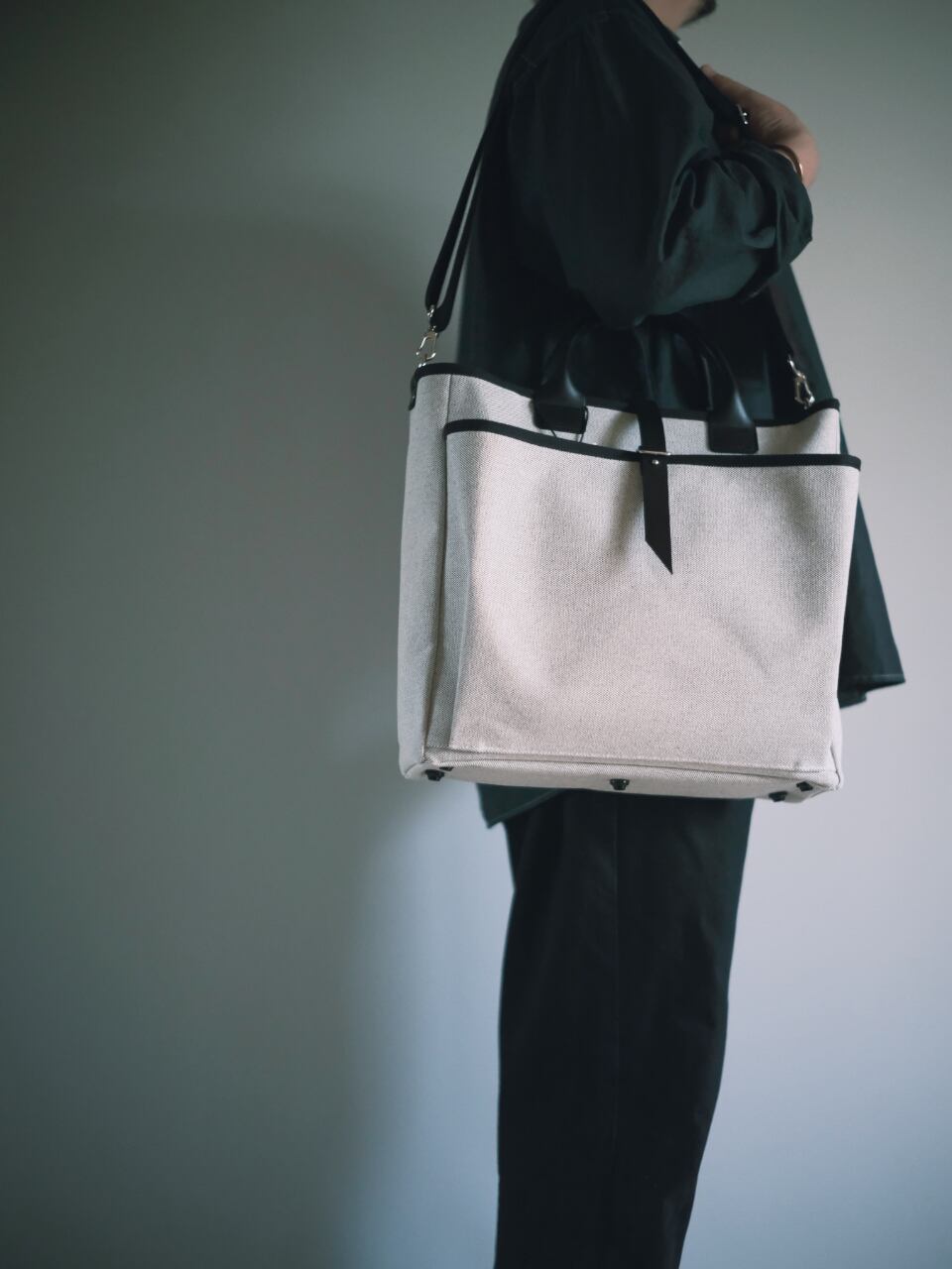 シンプルなデザインだからこその厳選素材。本体にはSouta Bagsオリジナルの約4号相当の国産帆布を使用。生成りと黒糸を限界まで打ち込んだ高密度の丈夫な厚手の生地が自慢です。
